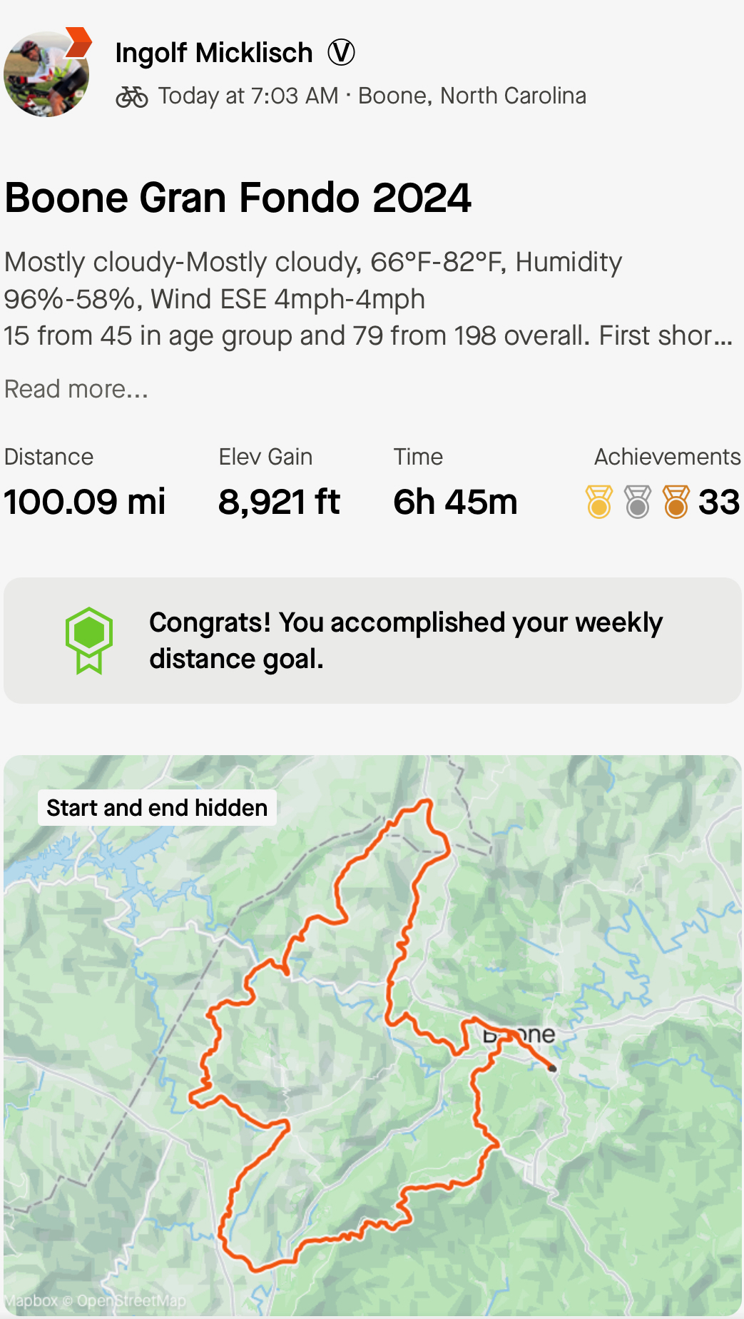 Had a cool Gran Fondo race in Boone NC last Sunday. First race since finishing RAAM in June. I still feel the power loss mainly during the final sprint i. The time sections. The good news was that I could keep power consistent during every climb. Had a few new PR’s on strava which shows I am getting back to normal power levels step by step. It was a fun race riding together with a friend. 15th out of 45 in my age group is acceptable to me for this race.