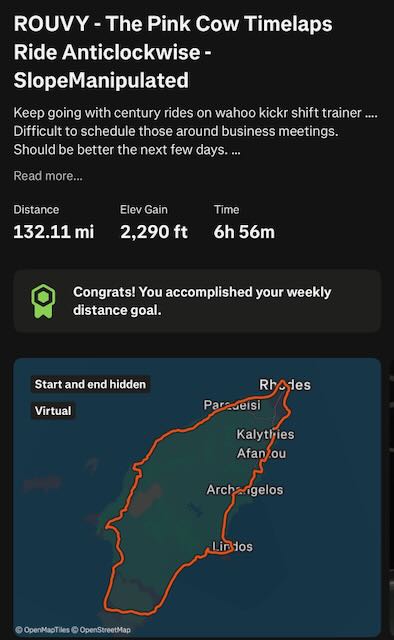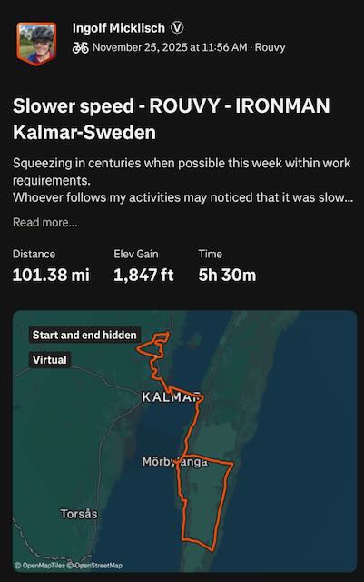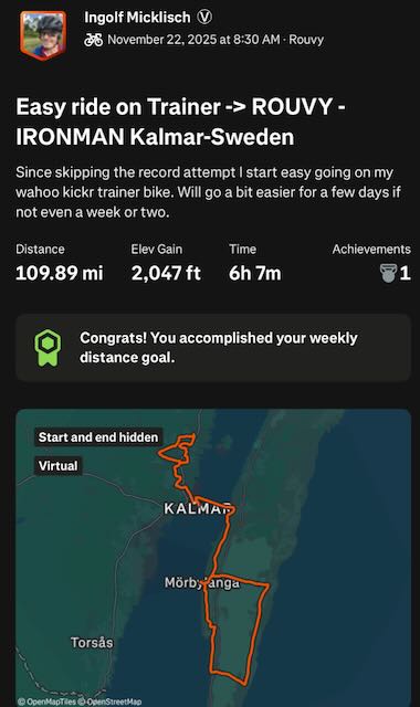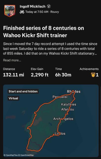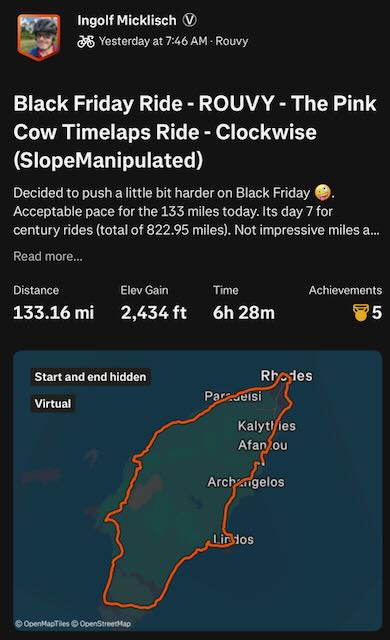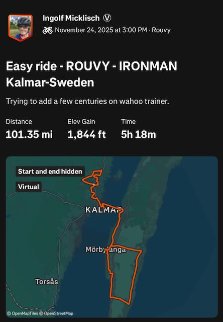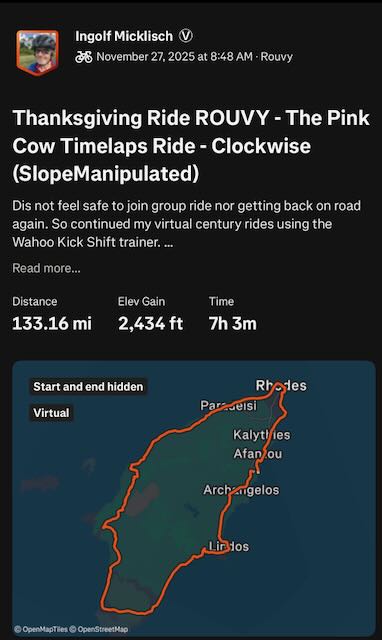 Since I moved the 7 day distance record attempt due to medical advice I used the time over Thanksgiving week to ride a series of 8 centuries (total about 855 miles / 1375 km)... It's still below my target for the Thanksgiving week but was a good test to see how I would do. For safety reasons I did ride all on the Wahoo Kickr Shift trainer bike. Most who know me know I do not like riding on trainer bikes but it's my only option t stay ion shape. The first days did show I was in bad conditions and doctors have been correct with their advice. Towards the end I did improve and it felt a bit better. Still trying to find a good week that may include a holiday to take off for the 7 day attempt. Will decide within the next week when to do it and if I actually even still do that in December or if January - March would be the better option. For now I may have to focus 2 more weeks with either no road rides or only slow and easy riding on the road. All rides in Thanksgiving week have been scheduled after work and before family events on Thanksgiving weekend